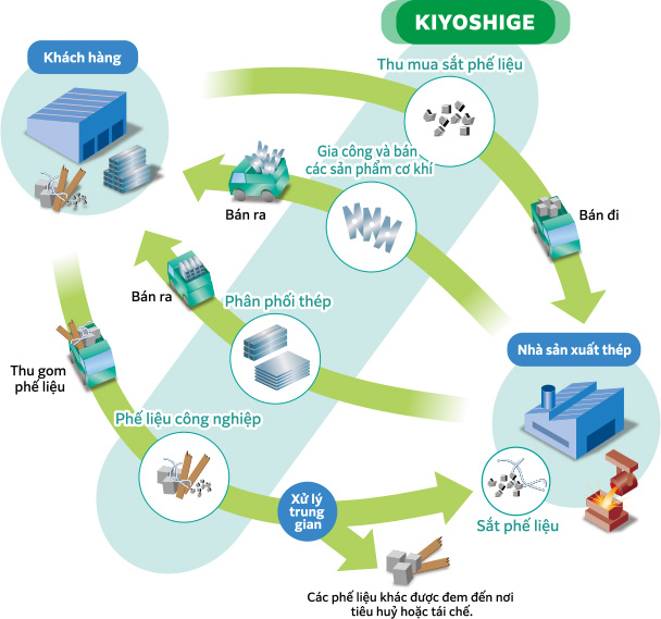 Kiyoshige từ khi bắt đầu kinh doanh phế liệu trong thời kỳ tăng trưởng kinh tế cao đã xem thép phế liệu như một nguồn tài nguyên. Gần đây, chúng tôi đã mở rộng lĩnh vực hoạt động kinh doanh của mình để đáp ứng nhu cầu không chỉ về sắt thép mà về cả chất thải công nghiệp nói chung. Từ góc độ muốn nâng cao hiệu quả công việc, chúng tôi cũng tự nguyện thực hiện các biện pháp an toàn và bảo vệ môi trường