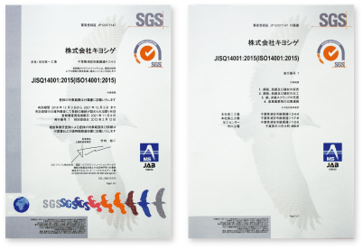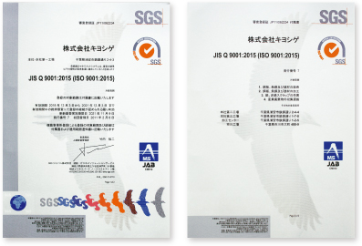 Kiyoshige giành chứng nhận ISO9001 vào tháng 2 năm 2011 và ISO14001 vào tháng 2 năm 2012.